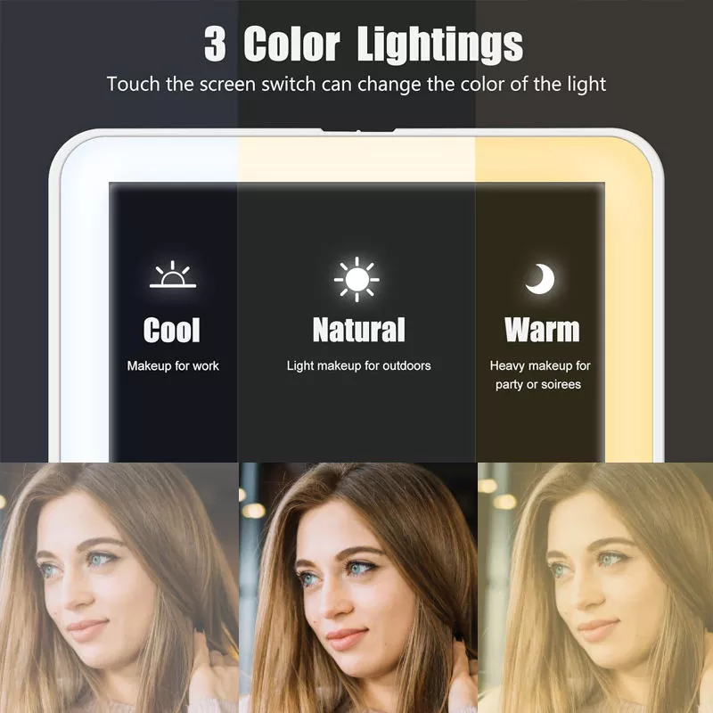 Tabletop Led Make Up Mirror iki nduweni telung mode cahya sing bisa diatur (kelangan, alami, anget) sing cocog karo kabeh skenario dandanan. Cahya sing adhem cocog kanggo dandanan kerja, cahya alami kanggo tampilan ruangan, lan cahya sing anget kanggo acara sore. Dering LED sing alus lan tanpa kelip-kelip menehi rendering warna sing nyata, njamin aplikasi dandanan sing akurat sanajan ing lingkungan sing surem.
